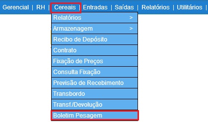 Para acessar, use o Menu “Cereais - Boletim Pesagem"