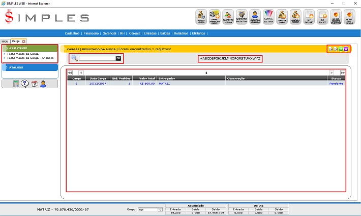 - Navegador: Nesta área se encontra as opções de Impremir Carga, Imprimir Relações dos Pedidos, Incluir Nova Carga, Editar Carga.