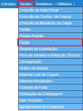 Para acessar a tela de Cargas, use o Menu “Saídas – Cargas”. Será apresentada a tela principal.