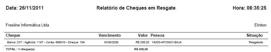 Após confirmar a mensagem, o usuário poderá tirar o relatório de cheques Resgatados, clicando sobre o ícone da impressora.