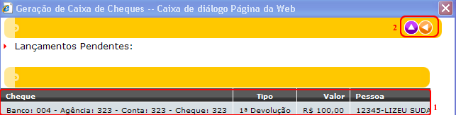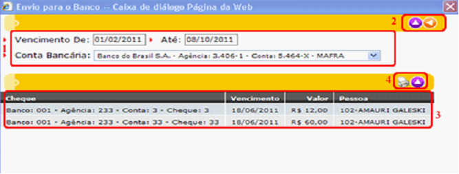 2. Navegador: Faz o filtro dos cheques no período e conta bancaria informada pelo usuário e Voltar para página anterior.