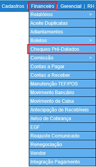 Para acessar Financeiro – Cheques Pré-Datados, use o Menu “ Financeiro – Cheques Pré Datados”. Será apresentada a tela principal de Cheques – Pré-Datados.