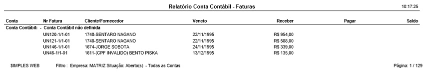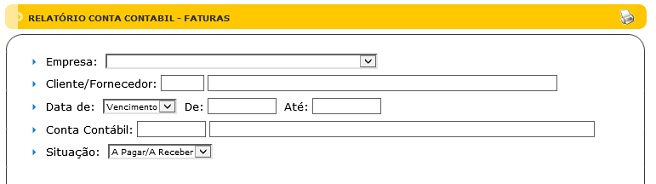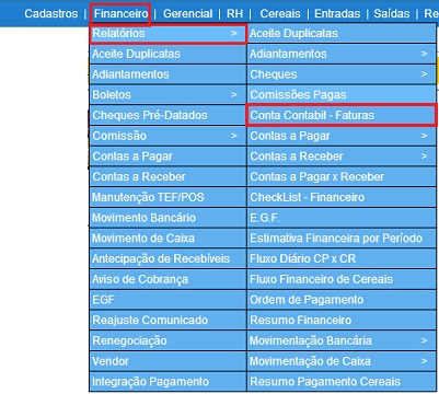 Para acessar este relatório é preciso ir ao Menu “ Financeiro - Relatórios - Conta Contábil - Faturas”.