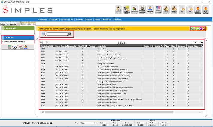- Grade de Contas Contábeis: Mostra todos as Contas Contábeis conforme os filtros descritos anteriormente.