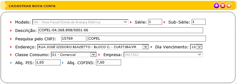 A tela do Cadastro de Contas Diversas possui dois elementos principais que executam  funções distintas, conforme seguem: