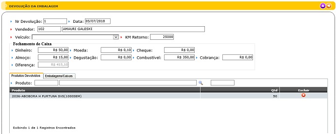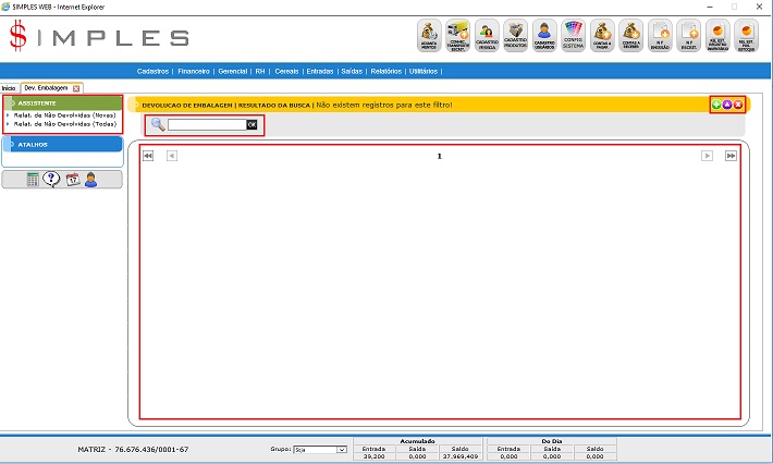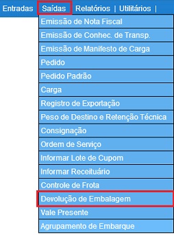 Para acessar a tela de Devolução de Embalagem, use o Menu “Saídas – Devolução de Embalagem”. Será apresentada a tela principal.