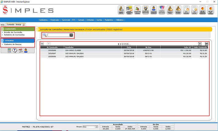 Para acessar Financeiro – Comissão - Definição, use o Menu “ Financeiro – Comissão - Divisão”. Será apresentada a tela principal de Comissão - Divisão.