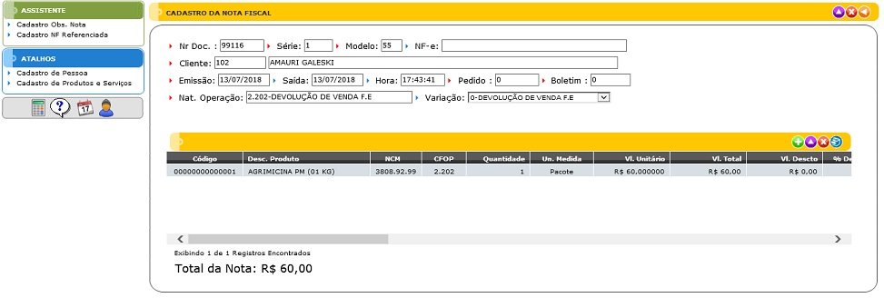 Ao clicar em "Incluir", a nota fiscal será aberta com seus dados e o respectivo produto selecionado com sua quantidade no item da nota para devolução.