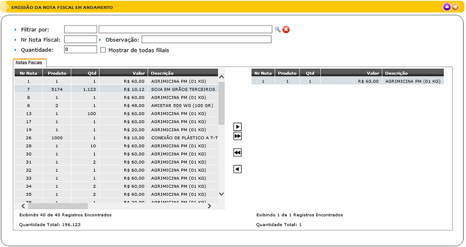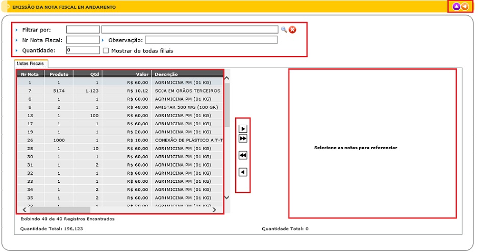 1. Filtros: Permite filtrar a grade do item 2 por produto ou número da nota fiscal.