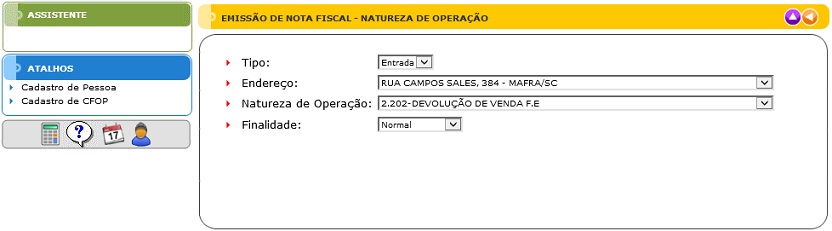 Obs.: vale lembrar que a operação de devolução é contrária a operação de origem. Neste caso, se o usuário pretende receber a devolução de um venda feita a um cliente (onde foi feita uma operação de "Saída" com CFOP "5.102" ou "6.102"), deve selecionar "Entrada" como tipo de nota e a natureza "1.202" ou "2.202", como mostra a figura abaixo: