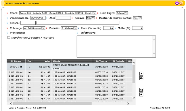 Será apresentada a tela principal de Boletos - Envio, que possui elementos principais que executam funções distintas, conforme seguem: