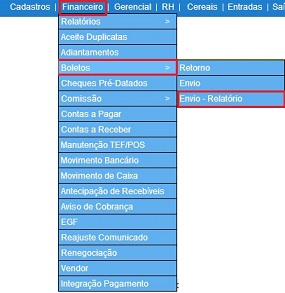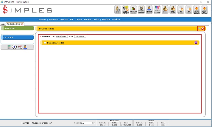 Para acessar o cadastro de Boletos Bancários - Envio - Relatório, use o Menu “ Financeiro Boletos - Envio - Relatório”. Será apresentada a tela principal de Boletos - Envio - Relatório, que possui elementos principais que executam funções distintas, conforme seguem: