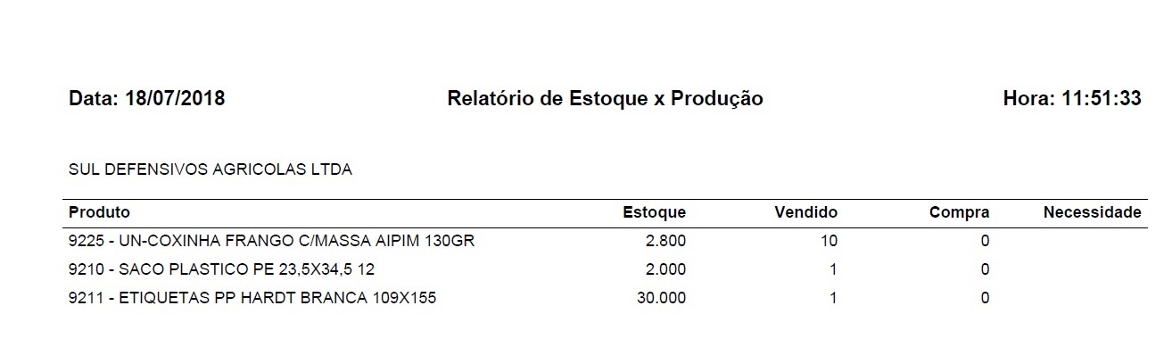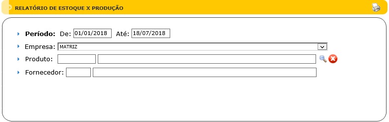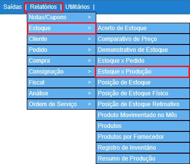Para acessar este relatório é preciso ir ao Menu “ Relatórios - Estoque - Estoque x Produção"