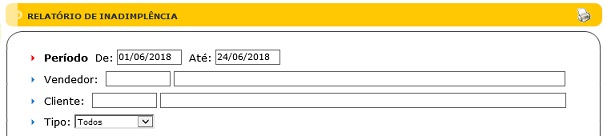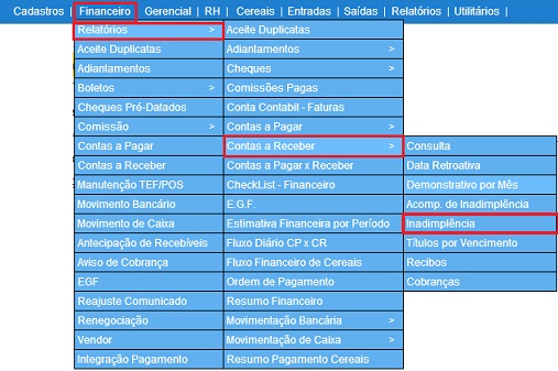 Para acessar este relatório é preciso ir ao Menu “ Financeiro - Relatórios - Contas a Receber - Inadimplência”.