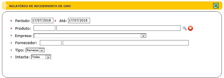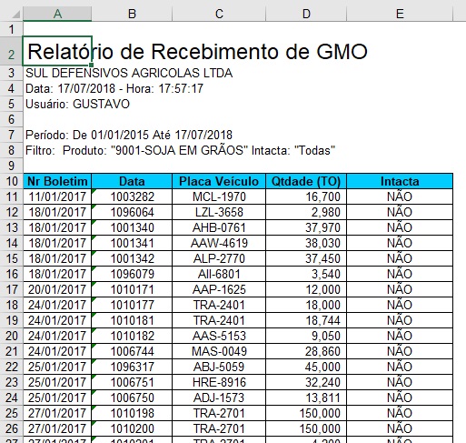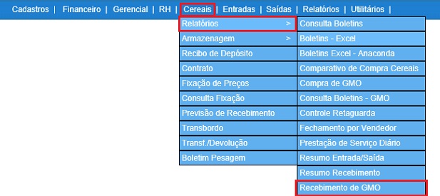 Para acessar, use o Menu “Cereais - Relatórios - Recebimento de GMO”.