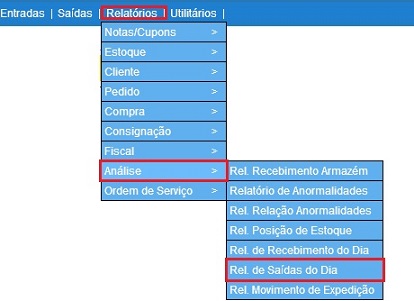 Para acessar este relatório é preciso ir ao Menu “ Relatórios - Análise - Relatório Saídas do Dia"