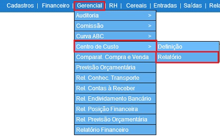 Para acessar, use o Menu “Gerencial - Centro de Custo - Relatório”.