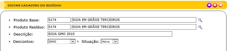A tela do Cadastro de Resíduos possui cinco elementos principais que executam funções distintas, conforme seguem: