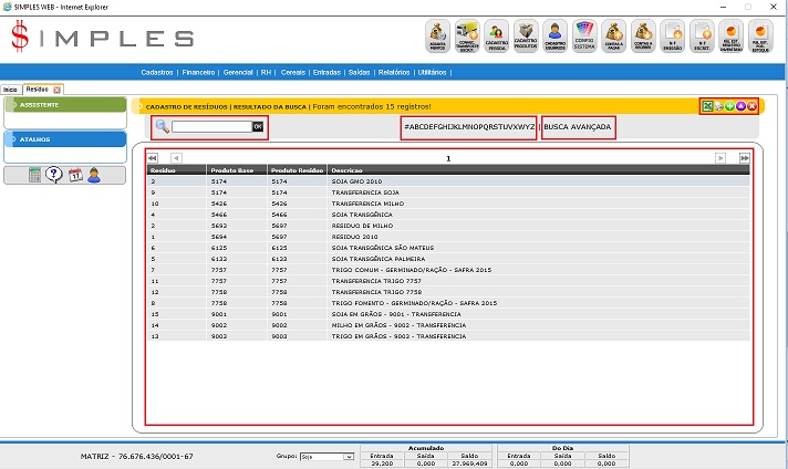 2. Grade de Resíduos: Mostra todos os Resíduos conforme os filtros descritos anteriormente.