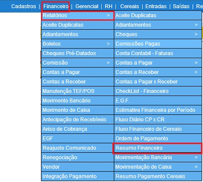 Para acessar este relatório é preciso ir ao Menu “ Financeiro - Relatórios - Resumo Financeiro”.