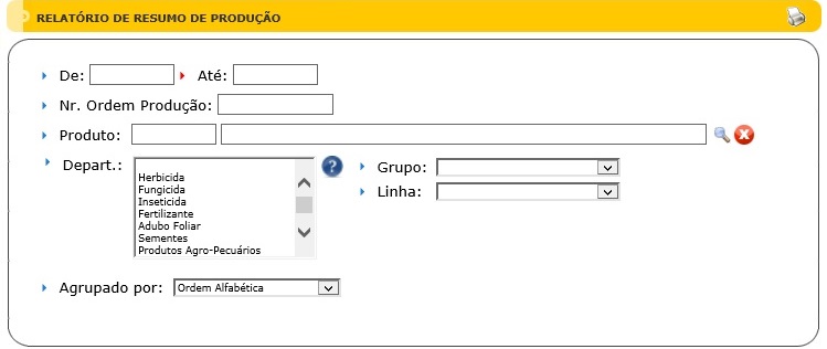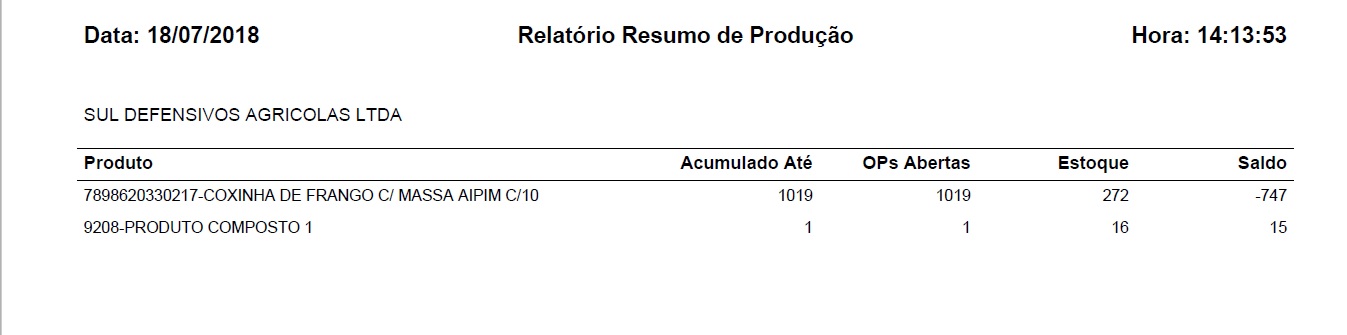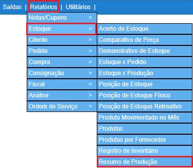 Para acessar este relatório é preciso ir ao Menu “ Relatórios- Estoque - Resumo Produção”.