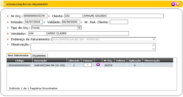 A seguir, os dados do orçamento selecionado são carregados, conforme figura abaixo:
