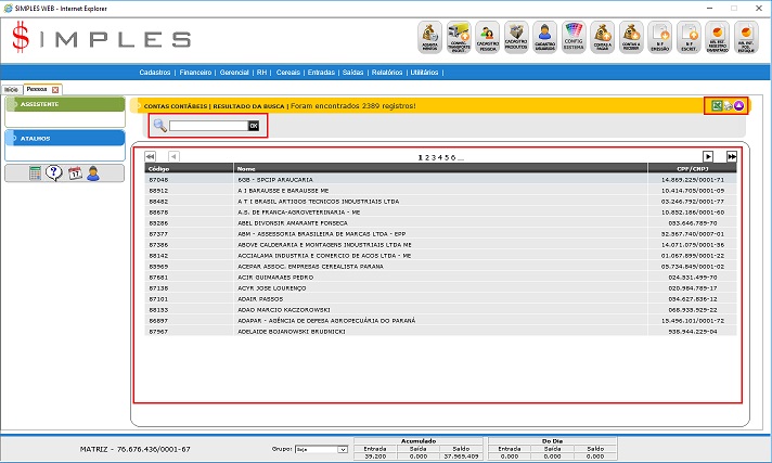 1. Pesquisa: Permite fazer uma pesquisa genérica pela razão social ou pelo código da pessoa.