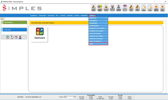 Para acessar esta Tela de Backup NF-e é preciso ir ao Menu “Utilitários - Sobre”.
