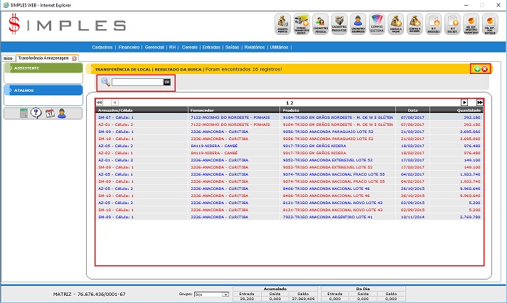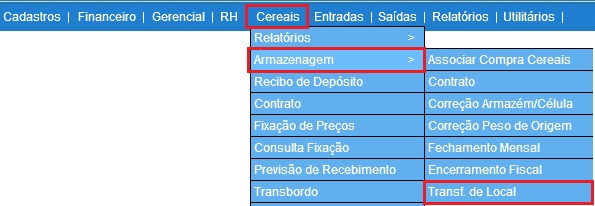 Para acessar, use o Menu “Cereais - Armazenagem - Tranferencia de Local”.