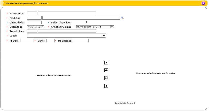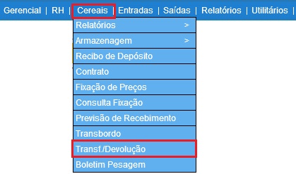 Para acessar, use o Menu “Cereais - Tranferência/Devolução"