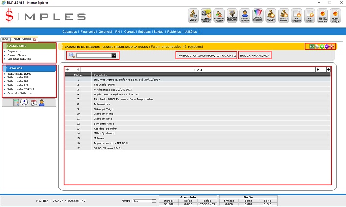 2. Pesquisa: Permite executar uma pesquisa usando a descrição dos Tributos - Classes.