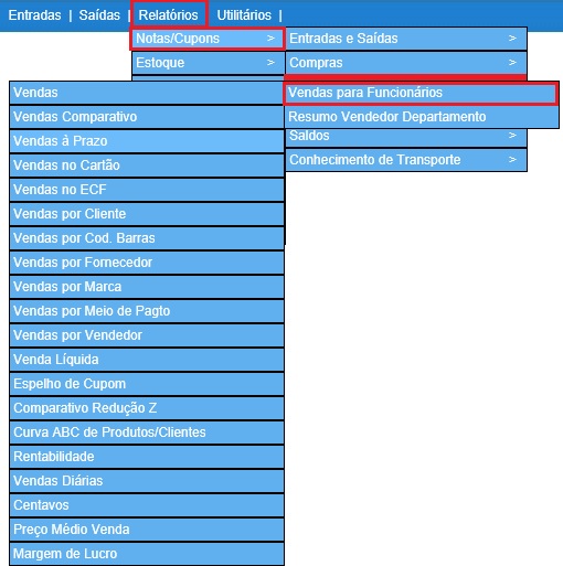 Para acessar este relatório é preciso ir ao Menu “ Relatórios - Notas/Cupons - Vendas - Vendas para Funcionários".