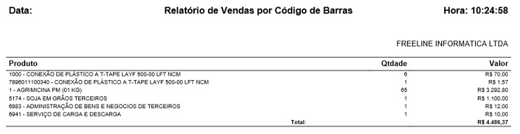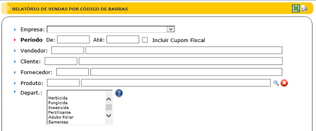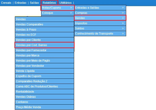 Para acessar este relatório é preciso ir ao Menu “ Relatórios - Notas/Cupons - Vendas - Vendas por Cod. de Barras”.